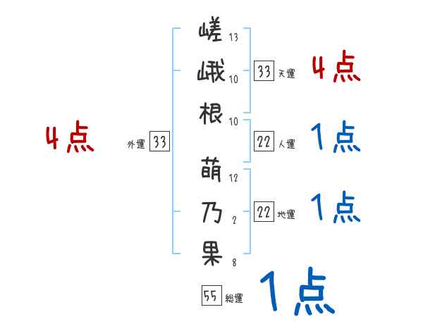 天運![]() | 嵯峨根萌乃果さんの天運は33画の4つ星!権力志向でプライドが高い。勇気があり運を切り開き成功する。 家系が持つ宿命的な運勢を表します。祖先から受け継いだ苗字ですので自分の力が及びません。家柄を象徴します。 |