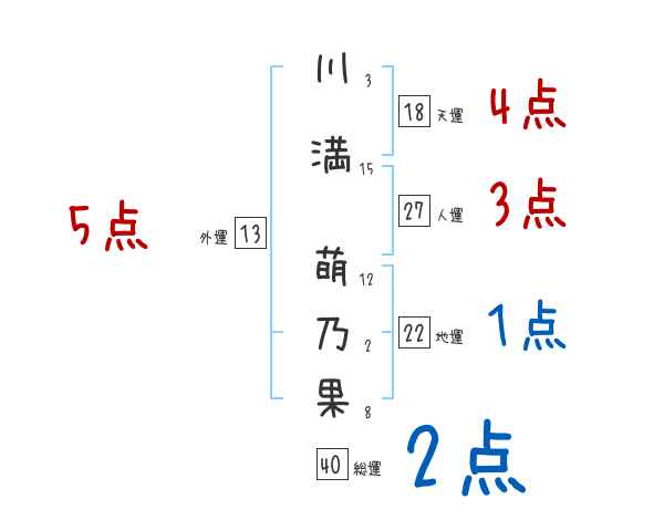 総運![]() | 川満萌乃果さんの総運は40画の2つ星!自信過剰で物事に固執するためトラブルに注意。 あなたの人生を表す1番重要な運勢です。生涯を通じて影響する総合運となり、主に50歳以降の晩年期に影響を及ぼします。 |