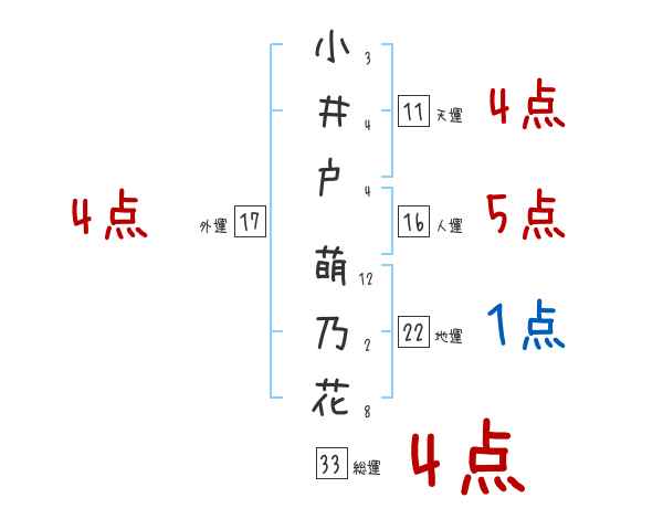 外運![]() | 小井戸萌乃花さんの外運は17画の4つ星!積極的な行動力。地位を気づき財産を手に入れる。純粋な心と直感力。 生活面を象徴する運勢です。外部から受ける影響力を表し、結婚運、家庭運や職場、環境への順応性を表します。 |