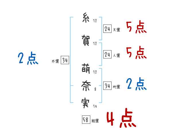 天運![]() | 糸賀萌奈実さんの天運は24画の5つ星!家庭運が良く順調な人生。金運にも恵まれる。 家系が持つ宿命的な運勢を表します。祖先から受け継いだ苗字ですので自分の力が及びません。家柄を象徴します。 |