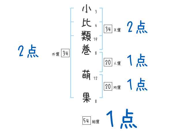 外運![]() | 小比類巻萌果さんの外運は34画の2つ星!独創性に優れるが、自尊心が強く災難に注意しましょう。 生活面を象徴する運勢です。外部から受ける影響力を表し、結婚運、家庭運や職場、環境への順応性を表します。 |