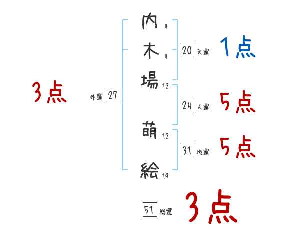 人運![]() | 内木場萌絵さんの人運は24画の5つ星!家庭運が良く順調な人生。金運にも恵まれる。 性格や才能などを表す2番目に重要な運勢です。人間関係や協調性、社会的な成功に影響します。主に20歳から50歳ぐらいまでの中年期の運勢を表します。 |
