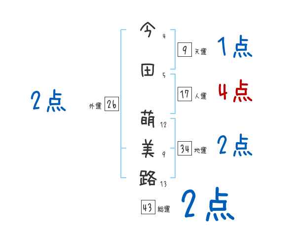 外運![]() | 今田萌美路さんの外運は26画の2つ星!波瀾万丈かも。信頼できる人を大事にしましょう。 生活面を象徴する運勢です。外部から受ける影響力を表し、結婚運、家庭運や職場、環境への順応性を表します。 |