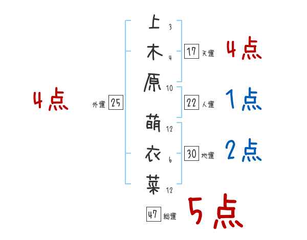 総運![]() | 上木原萌衣菜さんの総運は47画の5つ星!実力が開花し発展する円満な人生。財に恵まれる。 あなたの人生を表す1番重要な運勢です。生涯を通じて影響する総合運となり、主に50歳以降の晩年期に影響を及ぼします。 |