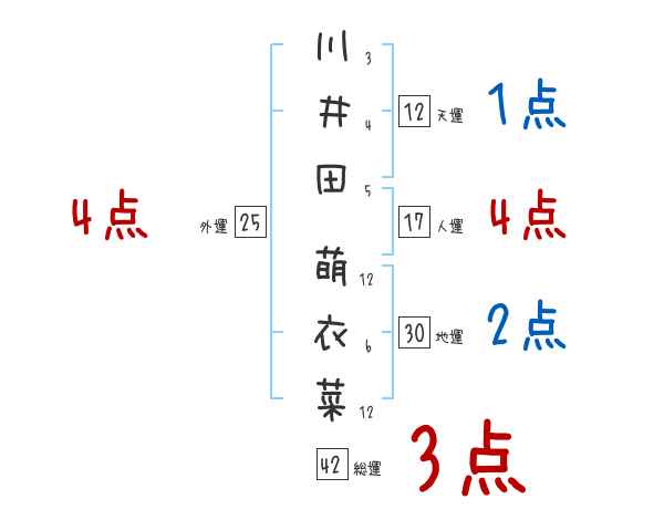総運![]() | 川井田萌衣菜さんの総運は42画の3つ星!病気に注意。多芸であるが消極的でおとなしい。 あなたの人生を表す1番重要な運勢です。生涯を通じて影響する総合運となり、主に50歳以降の晩年期に影響を及ぼします。 |