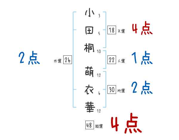 外運![]() | 小田桐萌衣華さんの外運は26画の2つ星!波瀾万丈かも。信頼できる人を大事にしましょう。 生活面を象徴する運勢です。外部から受ける影響力を表し、結婚運、家庭運や職場、環境への順応性を表します。 |