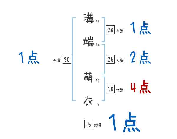 総運![]() | 溝端萌衣さんの総運は46画の1つ星!迷走することが多く苦労するかも。目先のことにとらわれないように。 あなたの人生を表す1番重要な運勢です。生涯を通じて影響する総合運となり、主に50歳以降の晩年期に影響を及ぼします。 |