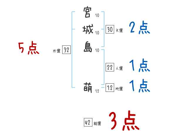 外運![]() | 宮城島萌さんの外運は32画の5つ星!柔軟性があり成功する。チャンスが多く金運が良い。 生活面を象徴する運勢です。外部から受ける影響力を表し、結婚運、家庭運や職場、環境への順応性を表します。 |