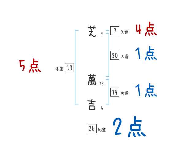 外運![]() | 芝萬吉さんの外運は13画の5つ星!才能に恵まれ人気がある。名声を手に入れる。円満な人生。 生活面を象徴する運勢です。外部から受ける影響力を表し、結婚運、家庭運や職場、環境への順応性を表します。 |