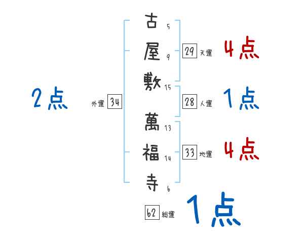 地運![]() | 古屋敷萬福寺さんの地運は33画の4つ星!権力志向でプライドが高い。勇気があり運を切り開き成功する。 個性を表す基礎的な運勢です。性格形成や対人関係、行動力など家庭環境に影響されます。主に誕生してから20歳くらいまでの若年期の運勢を表します。 |