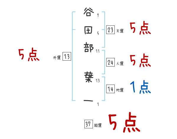 外運![]() | 谷田部葉一さんの外運は13画の5つ星!才能に恵まれ人気がある。名声を手に入れる。円満な人生。 生活面を象徴する運勢です。外部から受ける影響力を表し、結婚運、家庭運や職場、環境への順応性を表します。 |