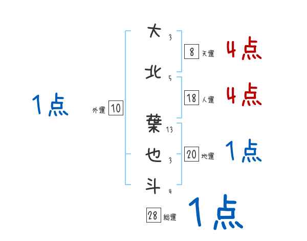 天運![]() | 大北葉也斗さんの天運は8画の4つ星!勤勉家。根気強く努力し成功する。忍耐力がある。 家系が持つ宿命的な運勢を表します。祖先から受け継いだ苗字ですので自分の力が及びません。家柄を象徴します。 |