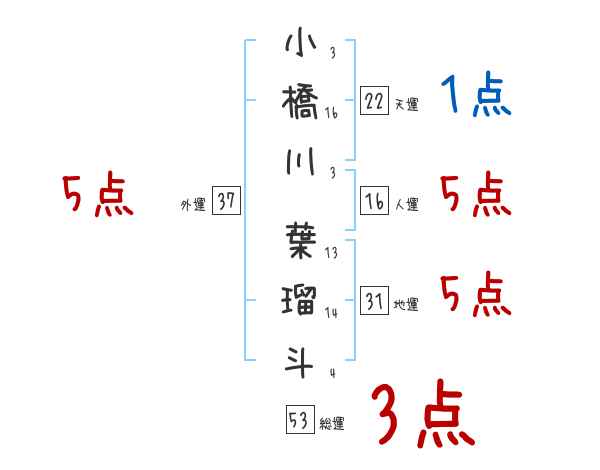 総運![]() | 小橋川葉瑠斗さんの総運は53画の3つ星!やや見栄っ張りで虚栄心がある。散財に注意。 あなたの人生を表す1番重要な運勢です。生涯を通じて影響する総合運となり、主に50歳以降の晩年期に影響を及ぼします。 |