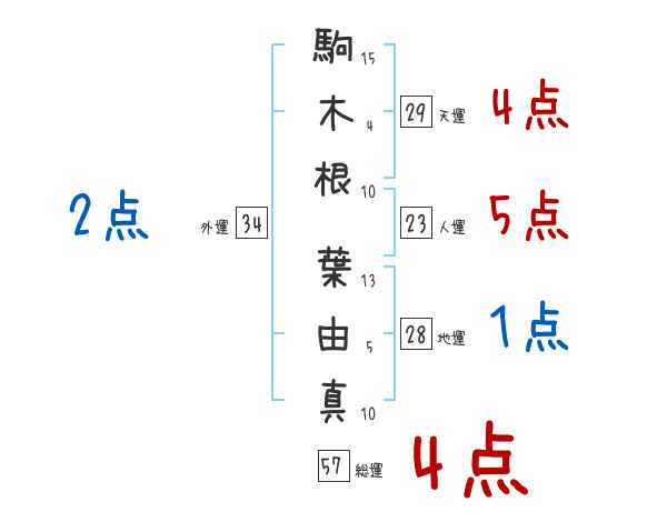 総運![]() | 駒木根葉由真さんの総運は57画の4つ星!向上心があり人望がある。地位を得る。 あなたの人生を表す1番重要な運勢です。生涯を通じて影響する総合運となり、主に50歳以降の晩年期に影響を及ぼします。 |