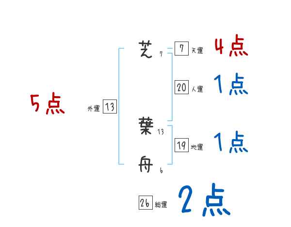 天運![]() | 芝葉舟さんの天運は7画の4つ星!強い意志や信念を持ち独立心が強い。自立する。 家系が持つ宿命的な運勢を表します。祖先から受け継いだ苗字ですので自分の力が及びません。家柄を象徴します。 |