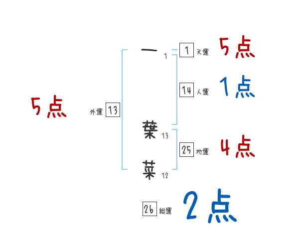 天運![]() | 一葉菜さんの天運は1画の5つ星!行動力、指導力があり出世し繁栄する。幸運に恵まれる。 家系が持つ宿命的な運勢を表します。祖先から受け継いだ苗字ですので自分の力が及びません。家柄を象徴します。 |