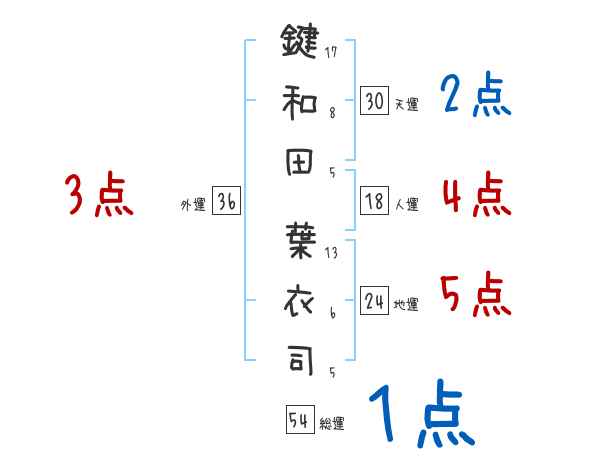 外運![]() | 鍵和田葉衣司さんの外運は36画の3つ星!先見性が豊かです。多少神経質で苦労することも。 生活面を象徴する運勢です。外部から受ける影響力を表し、結婚運、家庭運や職場、環境への順応性を表します。 |