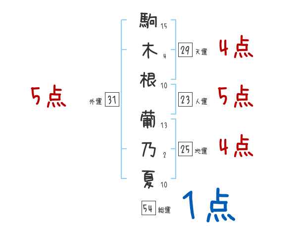 天運![]() | 駒木根葡乃夏さんの天運は29画の4つ星!完全主義で才能がある。厳格な心の持ち主。 家系が持つ宿命的な運勢を表します。祖先から受け継いだ苗字ですので自分の力が及びません。家柄を象徴します。 |