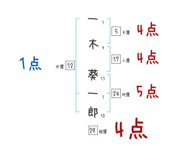天運![]() | 一木葵一郎さんの天運は5画の4つ星!健康で安泰。協調性に優れ、財産に恵まれる。 家系が持つ宿命的な運勢を表します。祖先から受け継いだ苗字ですので自分の力が及びません。家柄を象徴します。 |