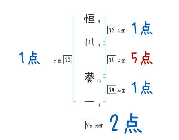 人運![]() | 恒川葵一さんの人運は16画の5つ星!人望が厚く大きく発展する。逆転成功が見える。 性格や才能などを表す2番目に重要な運勢です。人間関係や協調性、社会的な成功に影響します。主に20歳から50歳ぐらいまでの中年期の運勢を表します。 |