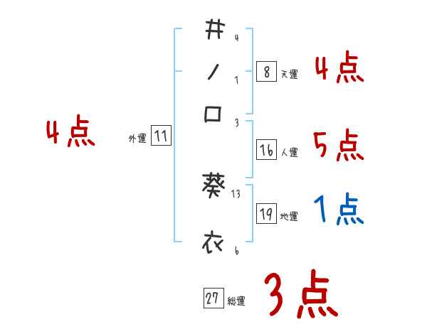 人運![]() | 井ノ口葵衣さんの人運は16画の5つ星!人望が厚く大きく発展する。逆転成功が見える。 性格や才能などを表す2番目に重要な運勢です。人間関係や協調性、社会的な成功に影響します。主に20歳から50歳ぐらいまでの中年期の運勢を表します。 |