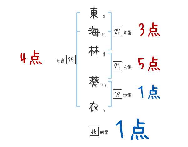 天運![]() | 東海林葵衣さんの天運は27画の3つ星!頭脳明晰だが強情で摩擦が多い傾向。孤立に注意。 家系が持つ宿命的な運勢を表します。祖先から受け継いだ苗字ですので自分の力が及びません。家柄を象徴します。 |