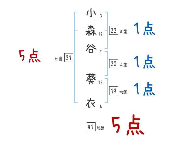 外運![]() | 小森谷葵衣さんの外運は21画の5つ星!統率力がある。独立し成功する。名誉を手に入れる。 生活面を象徴する運勢です。外部から受ける影響力を表し、結婚運、家庭運や職場、環境への順応性を表します。 |