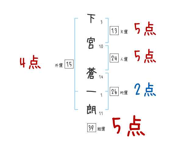 総運![]() | 下宮蒼一朗さんの総運は39画の5つ星!社交性に優れ人望が厚い。人の上に立ち成功する。 あなたの人生を表す1番重要な運勢です。生涯を通じて影響する総合運となり、主に50歳以降の晩年期に影響を及ぼします。 |