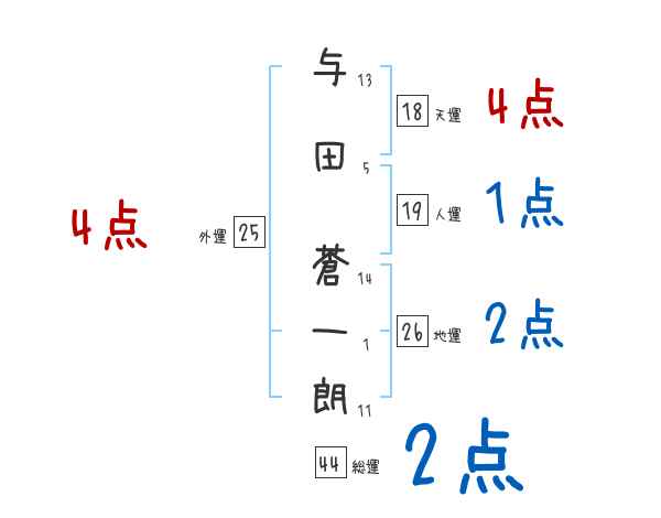 総運![]() | 与田蒼一朗さんの総運は44画の2つ星!誠実で慎重な性格。物事を考えすぎないように注意しましょう。 あなたの人生を表す1番重要な運勢です。生涯を通じて影響する総合運となり、主に50歳以降の晩年期に影響を及ぼします。 |