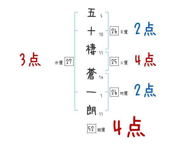 人運![]() | 五十棲蒼一朗さんの人運は25画の4つ星!個性があり才能があふれる。強運の持ち主で発展する。 性格や才能などを表す2番目に重要な運勢です。人間関係や協調性、社会的な成功に影響します。主に20歳から50歳ぐらいまでの中年期の運勢を表します。 |