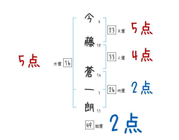 天運![]() | 今藤蒼一朗さんの天運は23画の5つ星!想像力に優れ活力がある。一代で成功し名誉を手に入れる。 家系が持つ宿命的な運勢を表します。祖先から受け継いだ苗字ですので自分の力が及びません。家柄を象徴します。 |