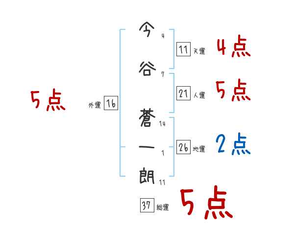 外運![]() | 今谷蒼一朗さんの外運は16画の5つ星!人望が厚く大きく発展する。逆転成功が見える。 生活面を象徴する運勢です。外部から受ける影響力を表し、結婚運、家庭運や職場、環境への順応性を表します。 |