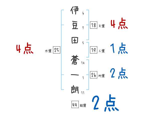 総運![]() | 伊豆田蒼一朗さんの総運は44画の2つ星!誠実で慎重な性格。物事を考えすぎないように注意しましょう。 あなたの人生を表す1番重要な運勢です。生涯を通じて影響する総合運となり、主に50歳以降の晩年期に影響を及ぼします。 |