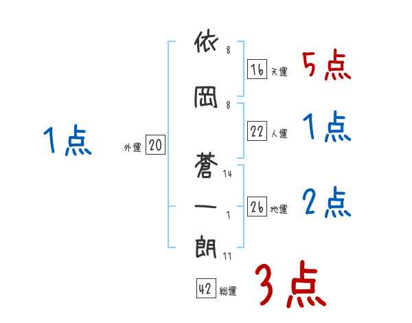 天運![]() | 依岡蒼一朗さんの天運は16画の5つ星!人望が厚く大きく発展する。逆転成功が見える。 家系が持つ宿命的な運勢を表します。祖先から受け継いだ苗字ですので自分の力が及びません。家柄を象徴します。 |