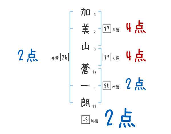 外運![]() | 加美山蒼一朗さんの外運は26画の2つ星!波瀾万丈かも。信頼できる人を大事にしましょう。 生活面を象徴する運勢です。外部から受ける影響力を表し、結婚運、家庭運や職場、環境への順応性を表します。 |