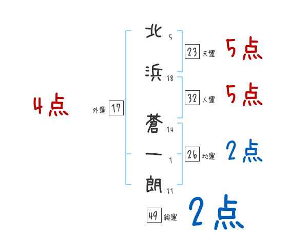 天運![]() | 北浜蒼一朗さんの天運は23画の5つ星!想像力に優れ活力がある。一代で成功し名誉を手に入れる。 家系が持つ宿命的な運勢を表します。祖先から受け継いだ苗字ですので自分の力が及びません。家柄を象徴します。 |