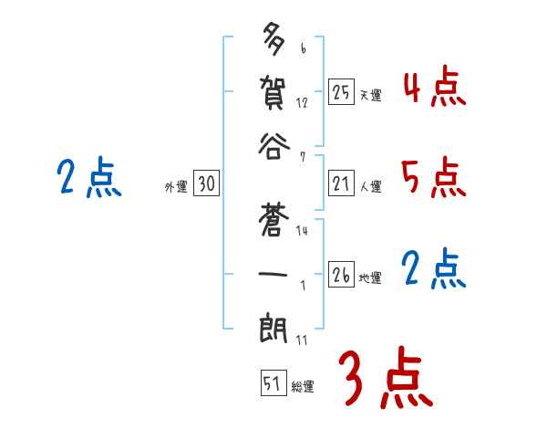 総運![]() | 多賀谷蒼一朗さんの総運は51画の3つ星!変化が激しく、危険に注意。堅実な性格。 あなたの人生を表す1番重要な運勢です。生涯を通じて影響する総合運となり、主に50歳以降の晩年期に影響を及ぼします。 |