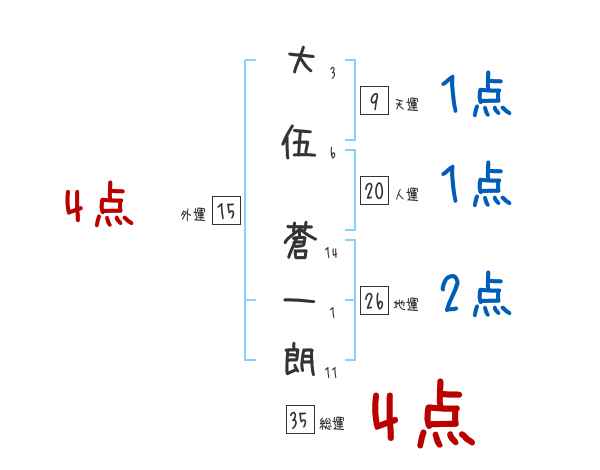 総運![]() | 大伍蒼一朗さんの総運は35画の4つ星!温厚な性格で感受性が高い。穏和な性格で人望が厚い。 あなたの人生を表す1番重要な運勢です。生涯を通じて影響する総合運となり、主に50歳以降の晩年期に影響を及ぼします。 |