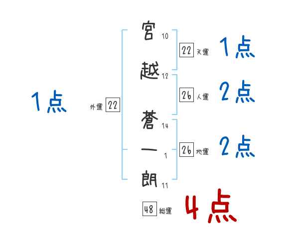 外運![]() | 宮越蒼一朗さんの外運は22画の1つ星!努力することが苦手ないっぽう手先が器用。芸術性にも優れる。 生活面を象徴する運勢です。外部から受ける影響力を表し、結婚運、家庭運や職場、環境への順応性を表します。 |