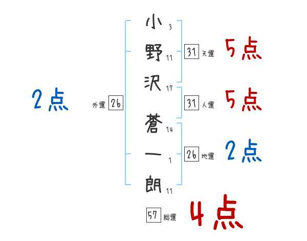 地運![]() | 小野沢蒼一朗さんの地運は26画の2つ星!波瀾万丈かも。信頼できる人を大事にしましょう。 個性を表す基礎的な運勢です。性格形成や対人関係、行動力など家庭環境に影響されます。主に誕生してから20歳くらいまでの若年期の運勢を表します。 |
