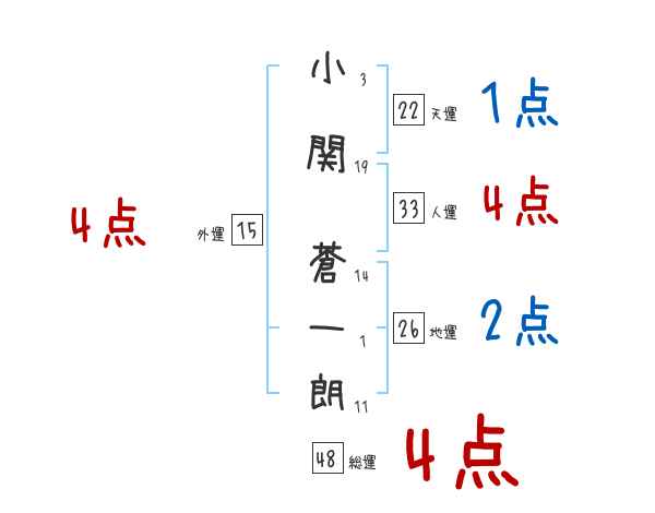 外運![]() | 小関蒼一朗さんの外運は15画の4つ星!人徳があり出世する。順調に物事を進め円満な人生。 生活面を象徴する運勢です。外部から受ける影響力を表し、結婚運、家庭運や職場、環境への順応性を表します。 |