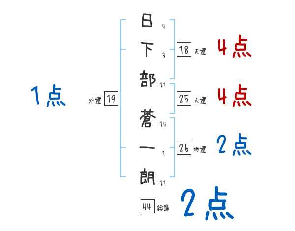 総運![]() | 日下部蒼一朗さんの総運は44画の2つ星!誠実で慎重な性格。物事を考えすぎないように注意しましょう。 あなたの人生を表す1番重要な運勢です。生涯を通じて影響する総合運となり、主に50歳以降の晩年期に影響を及ぼします。 |