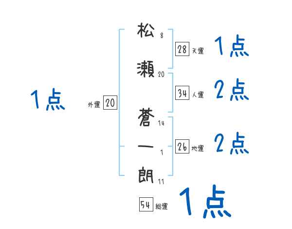 総運![]() | 松瀬蒼一朗さんの総運は54画の1つ星!トラブルが多いかも。周りをよく見て協調して過ごしましょう。 あなたの人生を表す1番重要な運勢です。生涯を通じて影響する総合運となり、主に50歳以降の晩年期に影響を及ぼします。 |