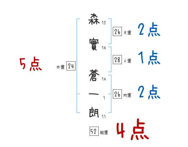 外運![]() | 森實蒼一朗さんの外運は24画の5つ星!家庭運が良く順調な人生。金運にも恵まれる。 生活面を象徴する運勢です。外部から受ける影響力を表し、結婚運、家庭運や職場、環境への順応性を表します。 |