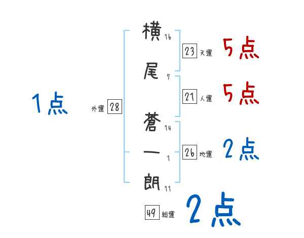 天運![]() | 横尾蒼一朗さんの天運は23画の5つ星!想像力に優れ活力がある。一代で成功し名誉を手に入れる。 家系が持つ宿命的な運勢を表します。祖先から受け継いだ苗字ですので自分の力が及びません。家柄を象徴します。 |