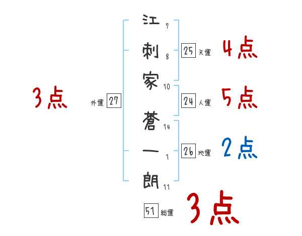 総運![]() | 江刺家蒼一朗さんの総運は51画の3つ星!変化が激しく、危険に注意。堅実な性格。 あなたの人生を表す1番重要な運勢です。生涯を通じて影響する総合運となり、主に50歳以降の晩年期に影響を及ぼします。 |