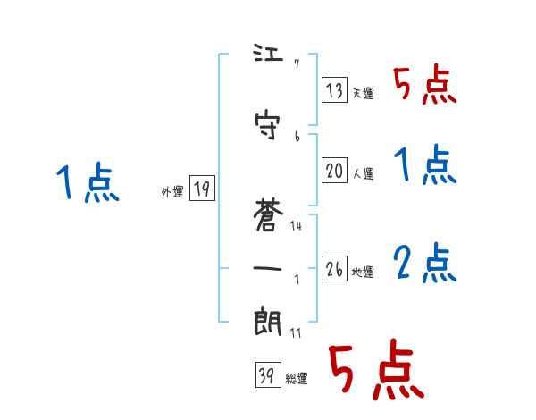 外運![]() | 江守蒼一朗さんの外運は19画の1つ星!優れた才能を持ちますが、協調性が足りないことも。周りの人と協力する事を意識しましょう。 生活面を象徴する運勢です。外部から受ける影響力を表し、結婚運、家庭運や職場、環境への順応性を表します。 |
