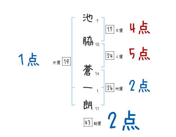 外運![]() | 池脇蒼一朗さんの外運は19画の1つ星!優れた才能を持ちますが、協調性が足りないことも。周りの人と協力する事を意識しましょう。 生活面を象徴する運勢です。外部から受ける影響力を表し、結婚運、家庭運や職場、環境への順応性を表します。 |