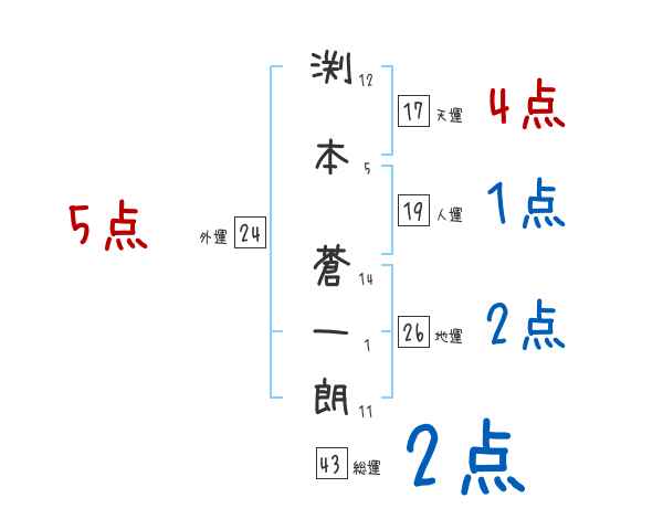 外運![]() | 渕本蒼一朗さんの外運は24画の5つ星!家庭運が良く順調な人生。金運にも恵まれる。 生活面を象徴する運勢です。外部から受ける影響力を表し、結婚運、家庭運や職場、環境への順応性を表します。 |