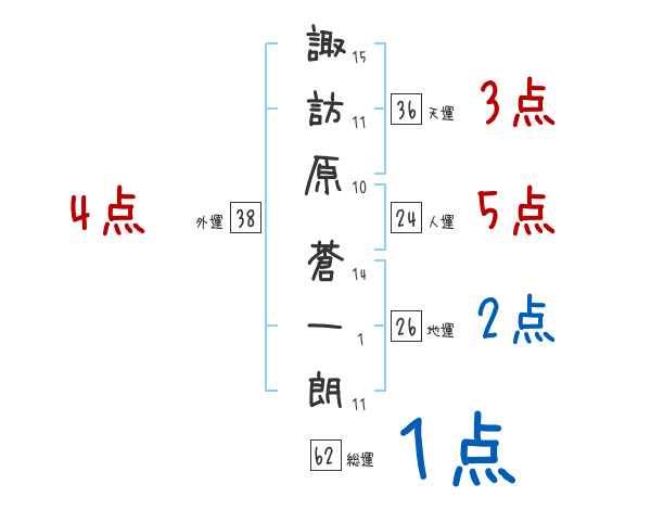 総運![]() | 諏訪原蒼一朗さんの総運は62画の1つ星!困難なトラブルが多く精神的に疲労しないように気をつけましょう。 あなたの人生を表す1番重要な運勢です。生涯を通じて影響する総合運となり、主に50歳以降の晩年期に影響を及ぼします。 |